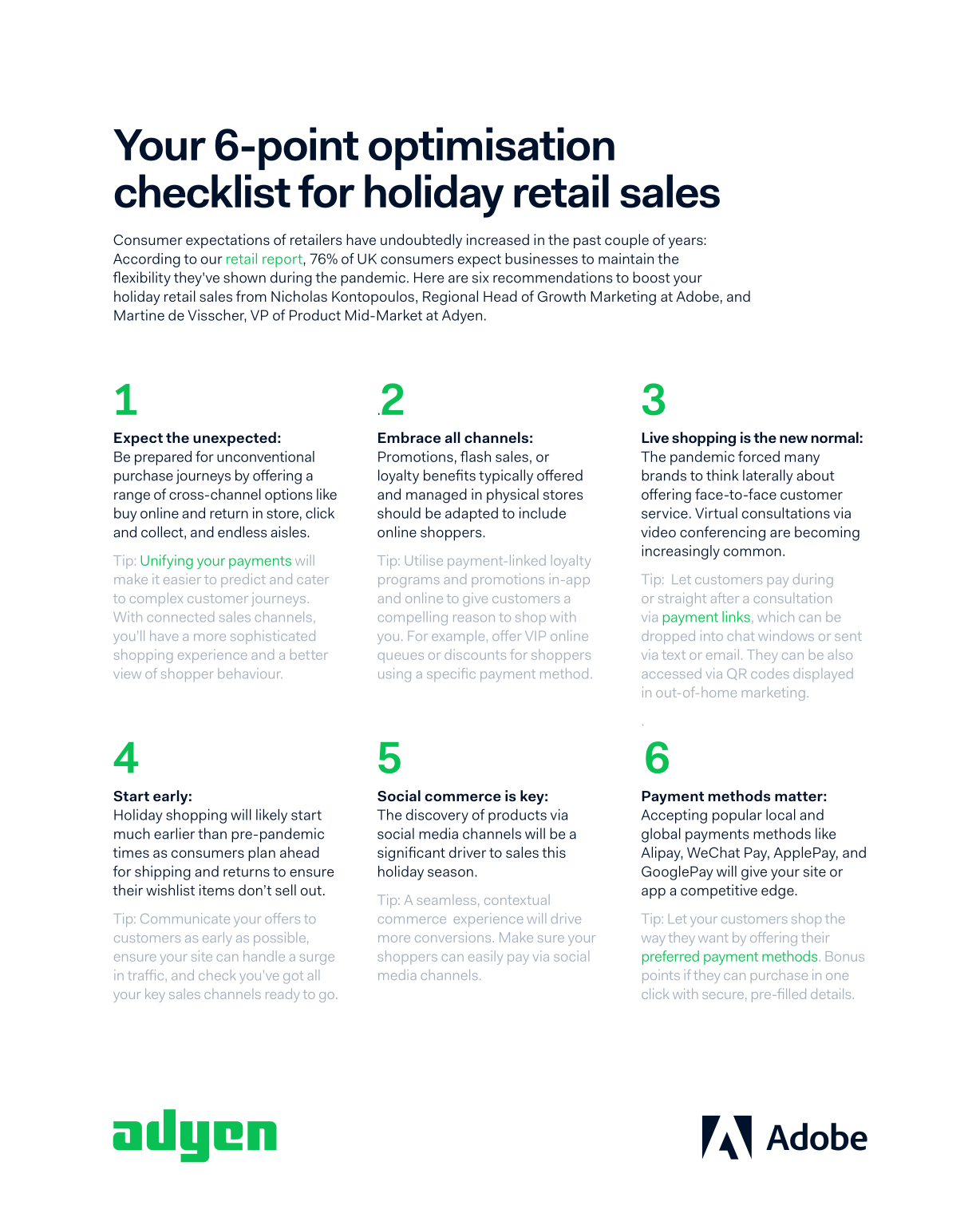 According to our new research, 53% of UK businesses believe that peak holiday retail sales periods are ‘make or break’. If that’s the case, optimising your conversions during this time is critical. To help you out, we spoke to Nicholas Kontopoulos, Regional Head of Growth Marketing atAdobe. The following article outlines his advice alongside that of Martine de Visscher, VP of Product Mid-Market at Adyen.