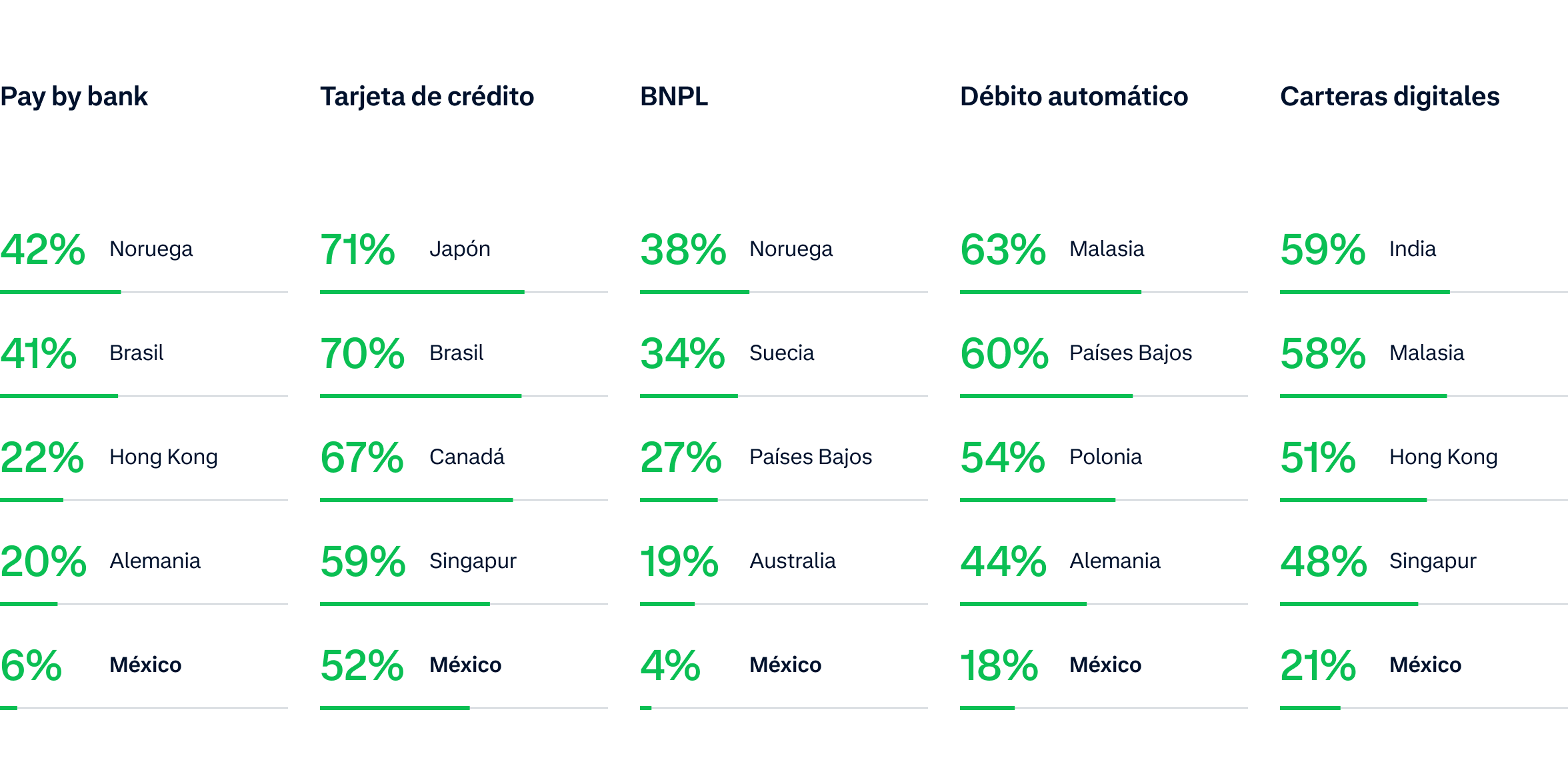 Mientras la mayoría de los consumidores todavía prefieren realizar pagos en línea con tarjetas de crédito, la relevancia de otros métodos de pago locales está creciendo rápidamente alrededor del mundo. En algunas partes de Asia, por ejemplo, el 40% de los consumidores prefieren usar billeteras digitales como Apple Pay y Google Pay™ para pagar en línea, mientras que solo el 26% de los consumidores en Estados Unidos prefieren las billeteras digitales. El método de "Comprar ahora, pagar después" también está siendo muy popular y ganando terreno en los mercados europeos, como Noruega (38%), Suecia (34%) y los Países Bajos (27%). Por último, los pagos Pay by Bank son un método de pago local en aumento en mercados como Brasil (41%) y Hong Kong (22%).