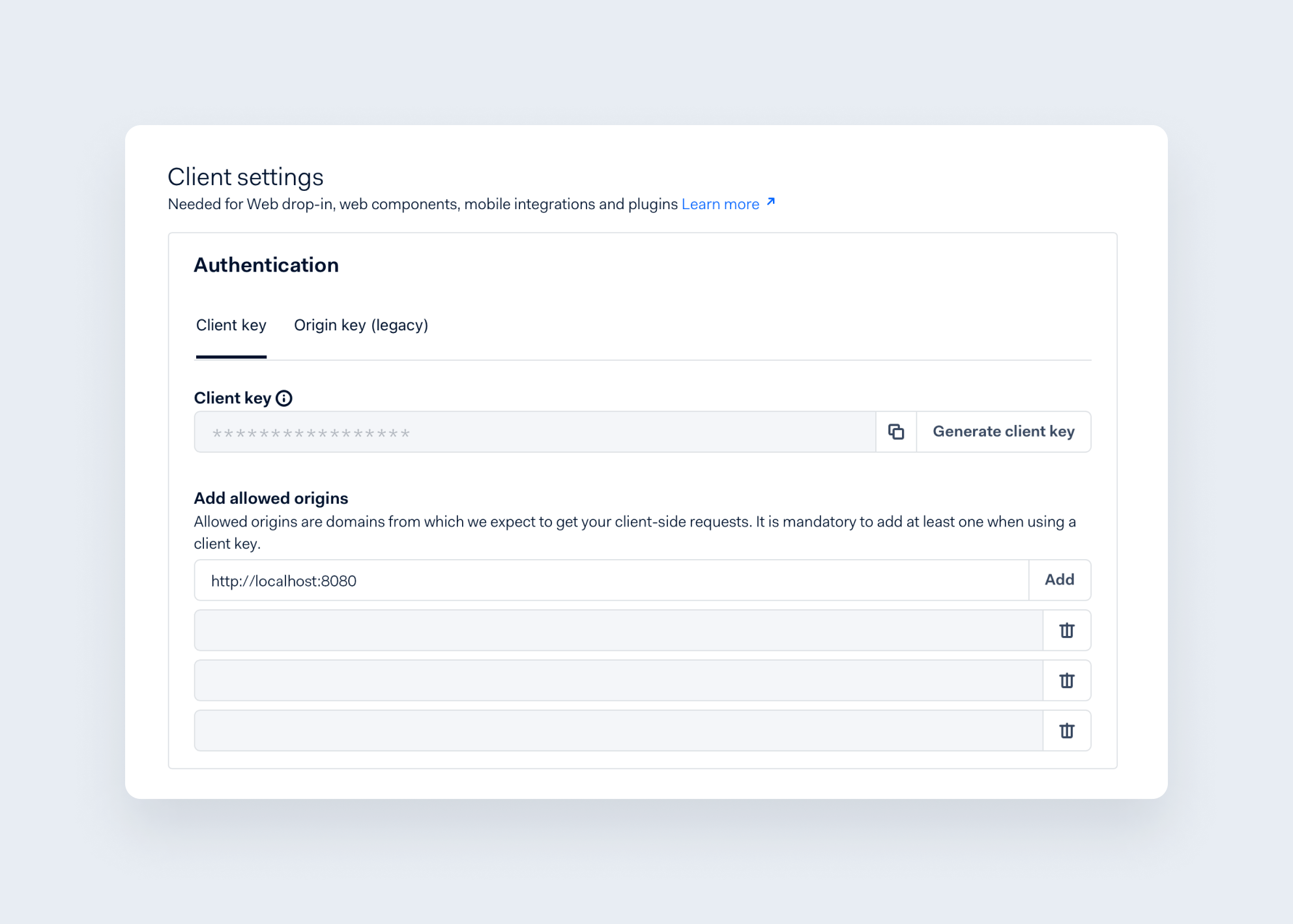 The client configuration, only necessary in the case of UI integrations (Drop-in, web components, native mobile integration, plugins), is part of the “Client Settings” section. The “Allowed Origins” list (i.e. hosts from which client-side requests can be originated) has also been redesigned. The hostnames are all clearly visible and it is easier to add/remove entries.