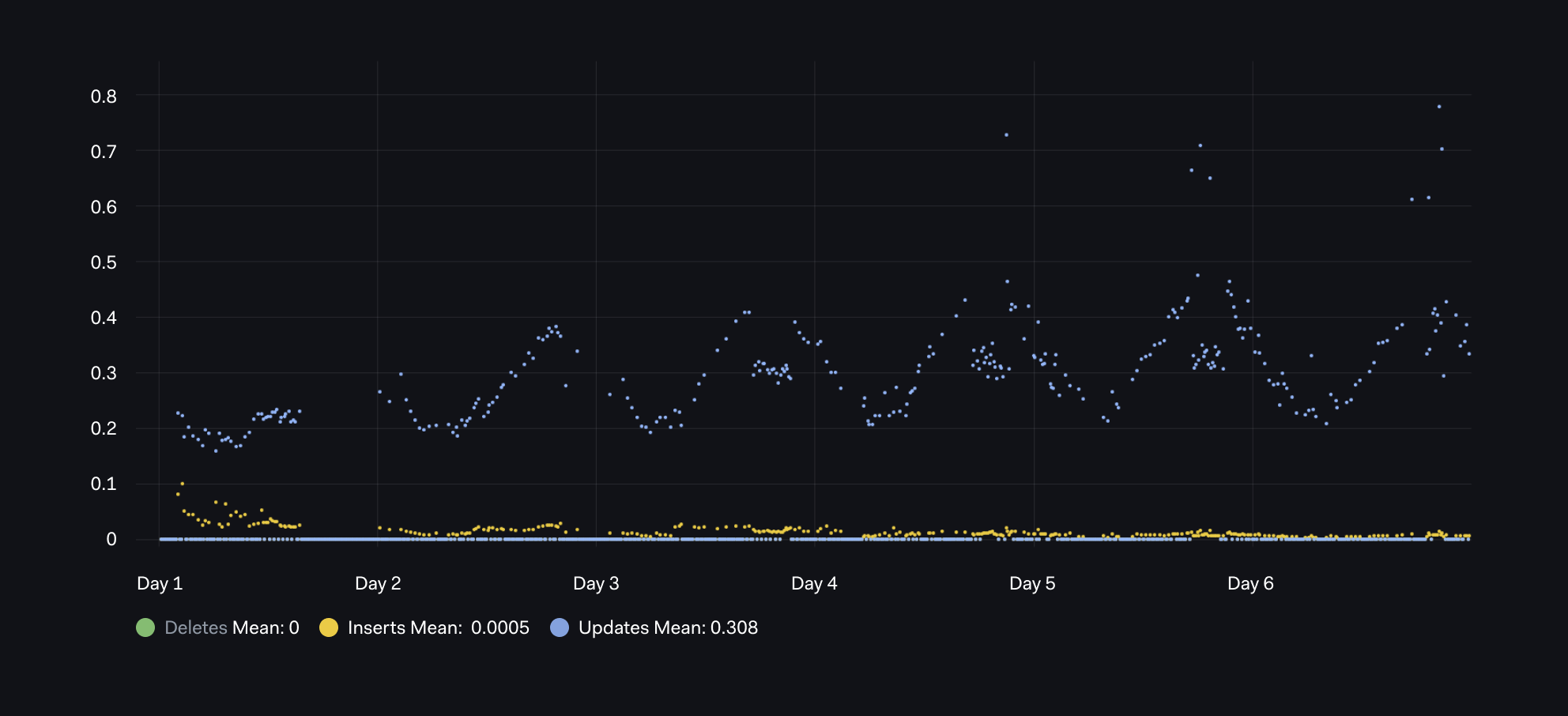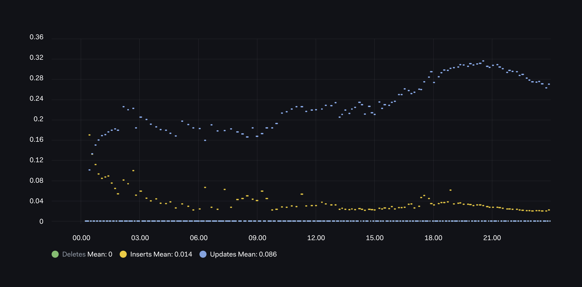 From this graph, we can interpret that over this day, there is a pattern with initially high inserts (yellow), but this is soon dominated by updates(blue) and no deletes.