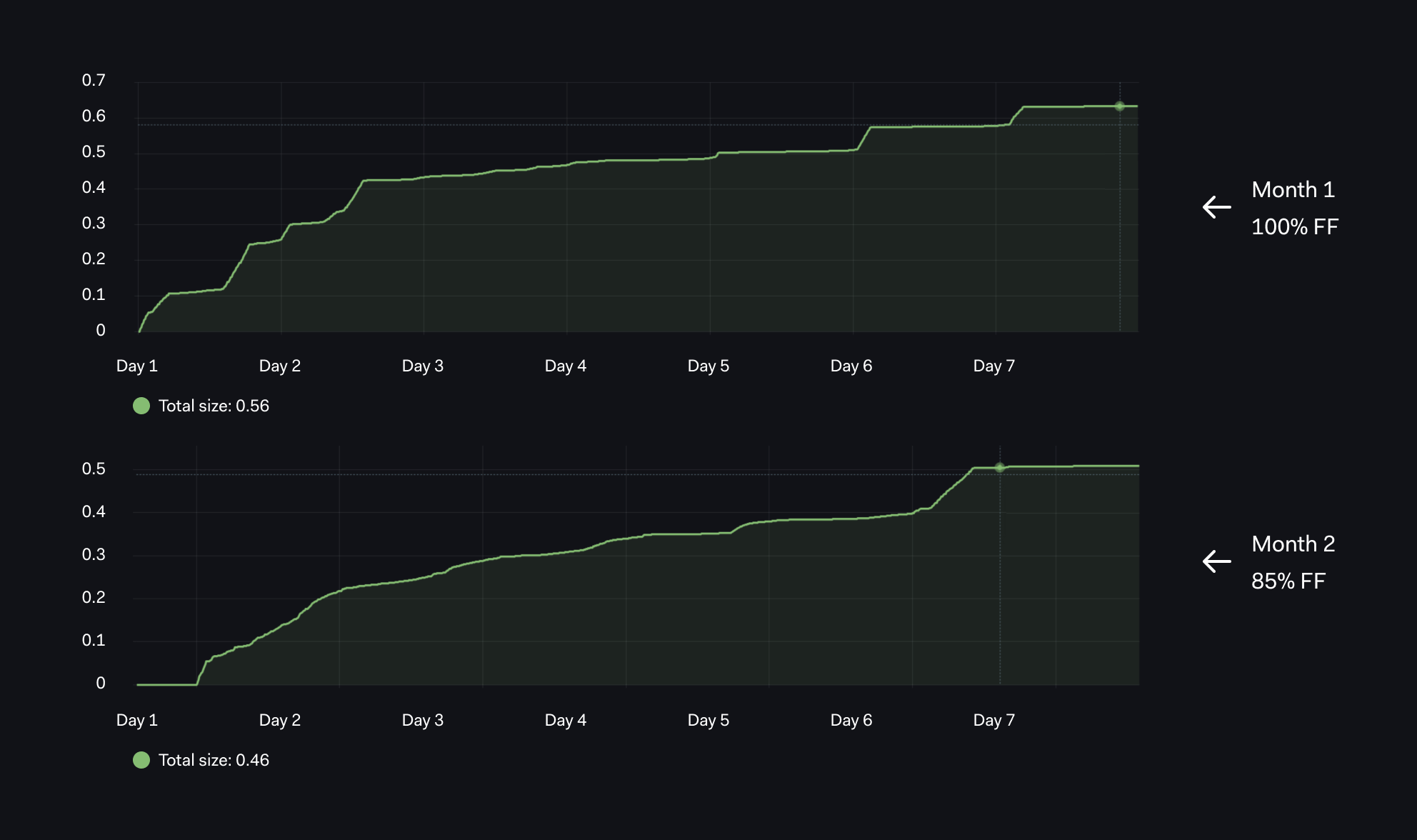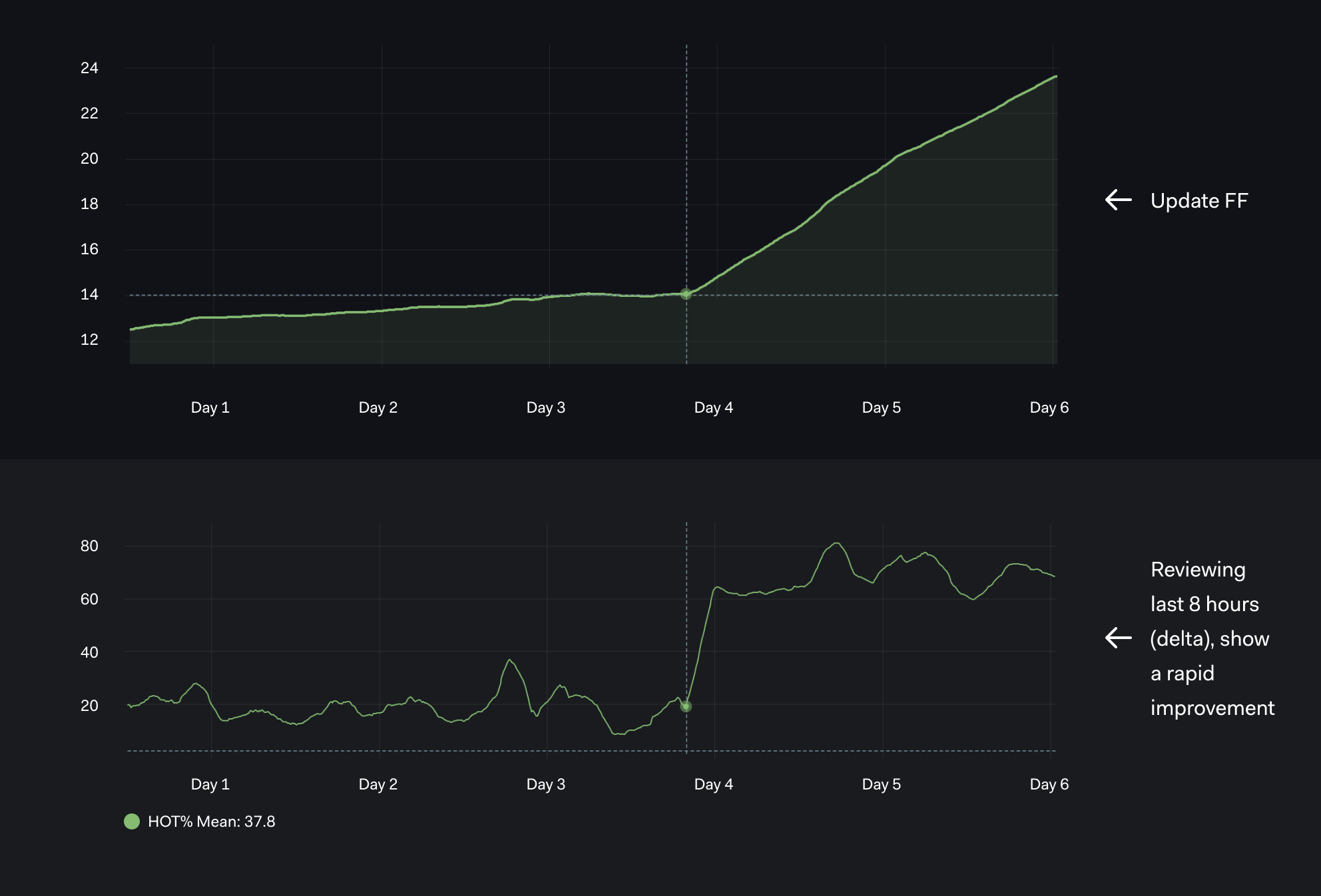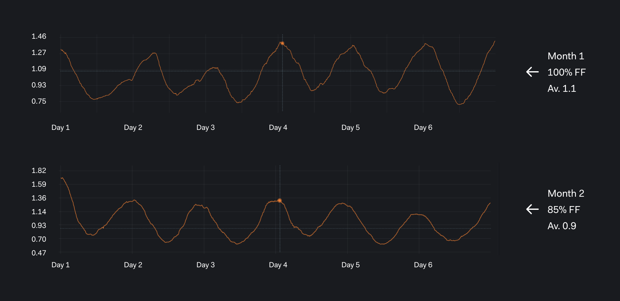 The effect of reducing the FF from 100% to 80% around between day 3 and day 4 is much clearer with the DELTA based chart.