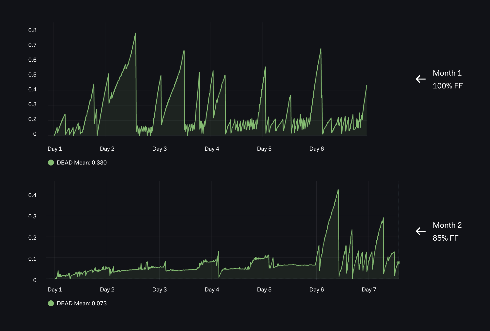 - In the first month, with default 100% FF, we average about 1.1, every 8 hours.