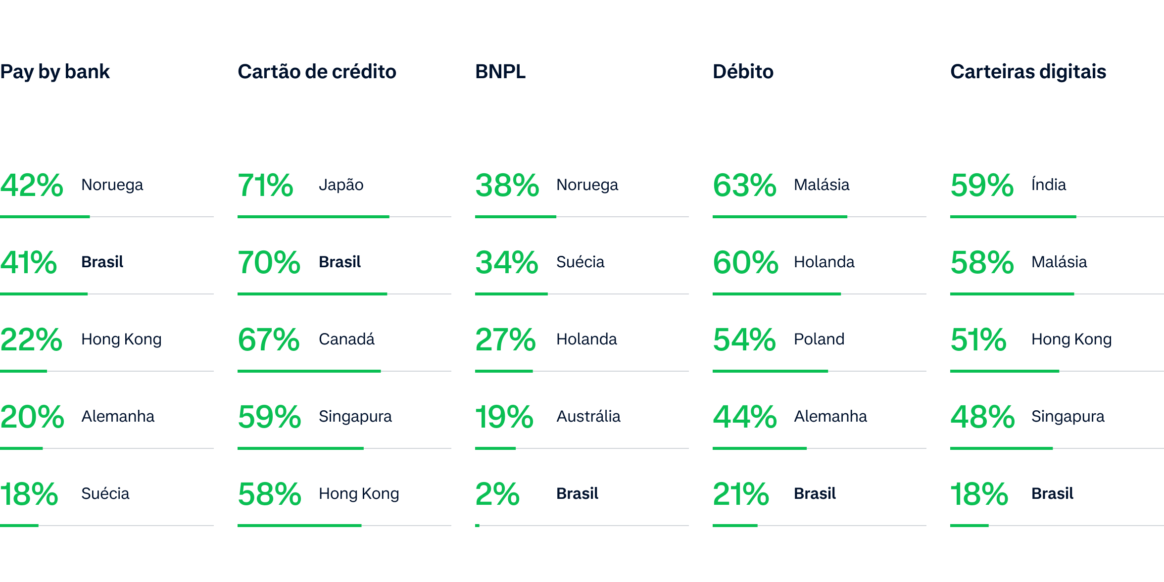 Embora a maioria dos consumidores ainda prefira fazer pagamentos on-line com cartões de crédito, a relevância dos métodos de pagamento locais está crescendo rapidamente em todo o mundo. Em partes da Ásia, por exemplo, 40% dos consumidores preferem usar carteiras digitais como Apple Pay e Google Wallet para fazer pagamentos on-line, enquanto apenas 26% dos consumidores nos EUA preferem carteiras digitais. O Buy Now, Pay Later também está se destacando, ganhando popularidade em mercados europeus como Noruega (38%), Suécia (34%) e Holanda (27%). Por fim, o Pay by Bank também é um método de pagamento local em ascensão em mercados como o Brasil (41%) e Hong Kong (22%).